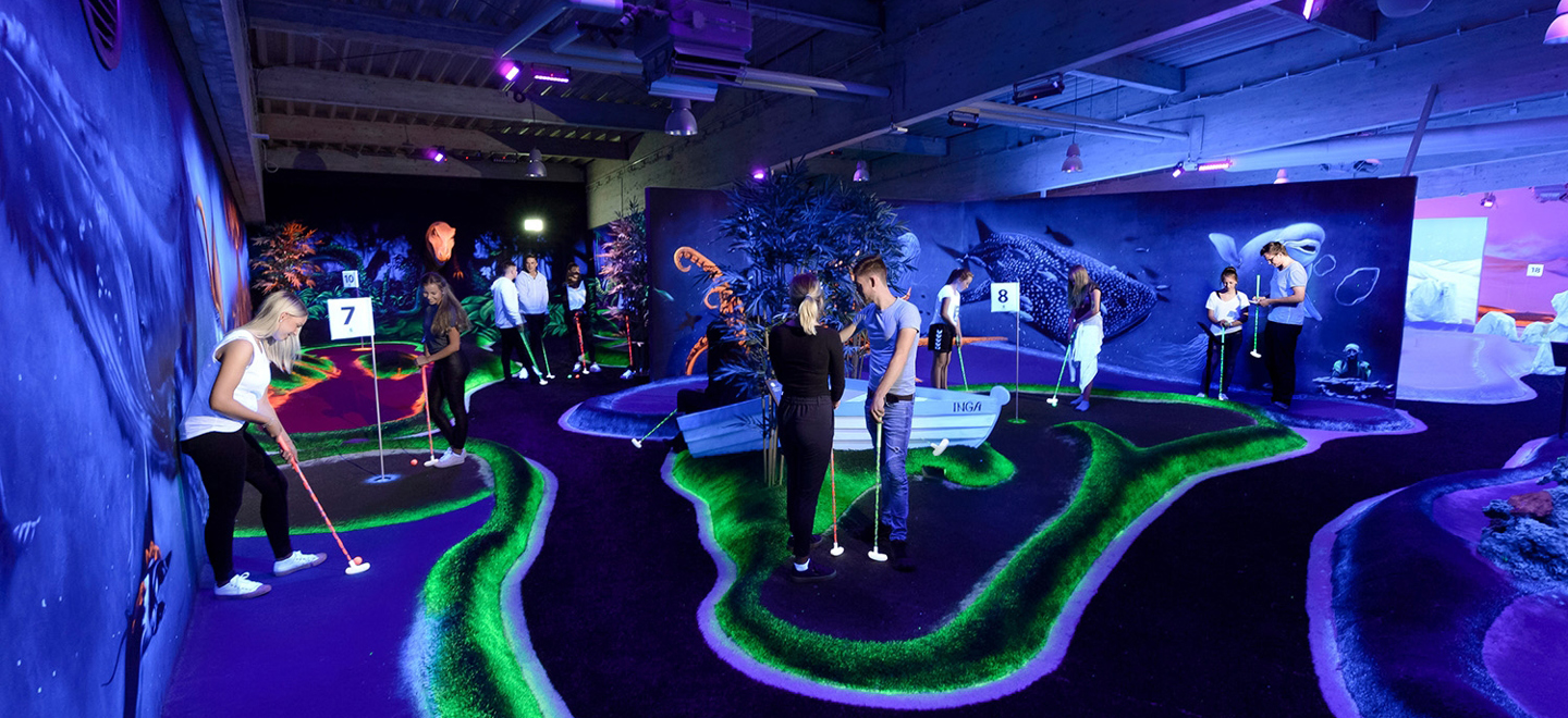 Our challenging, indoor, glow-in-the-dark Blacklight courses add a new dimension to the game of mini golf. Fluorescent UV lighting makes putters, balls and obstacles glow in bright colours, and brings the spectacular artwork on the surrounding walls and floors to life.