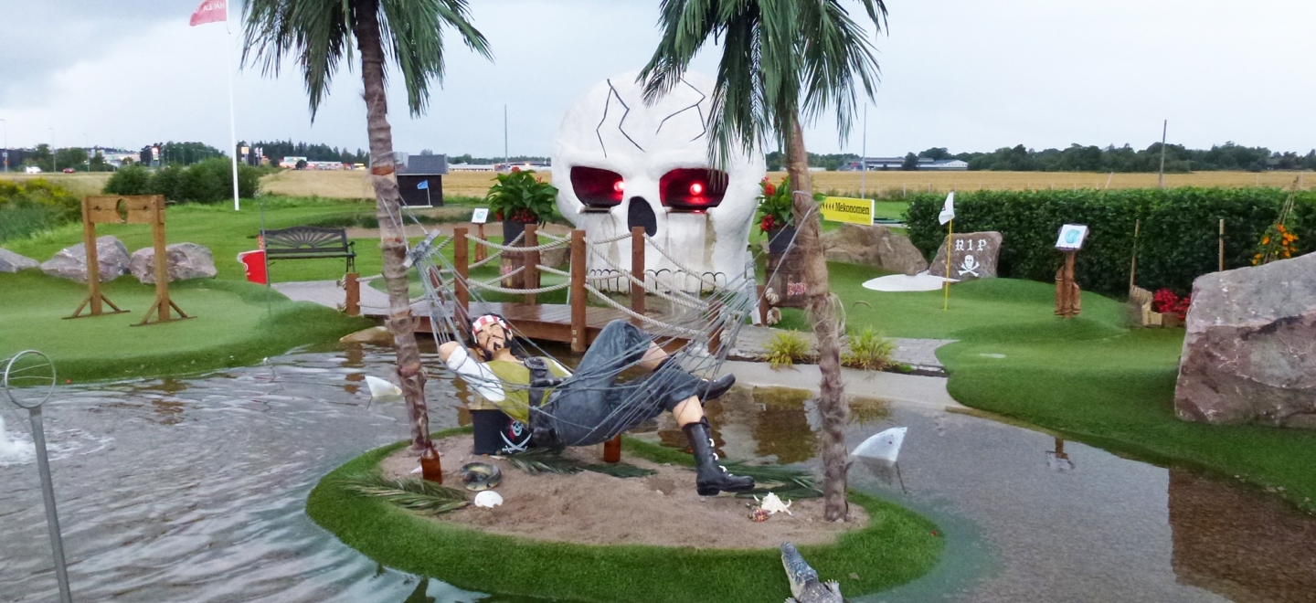 The Pirate Golf course is adapted for the disabled, and each hole can be played in an easy or hard way. Next to the course are a small ice-cream / coffee shop, and restrooms. We advise you to bring a change of clothes, including shoes, because for most children it is irresistible to jump in behind the two waterfalls flowing out through the eyes in the giant skull and get soaking wet.