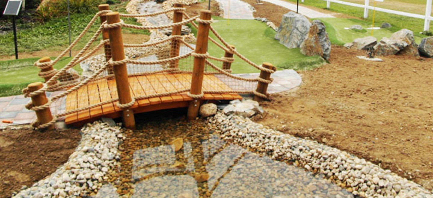 The customer wanted a 9 holes Adventure golf area with natural look, water lake and a wooden bridge. The course will be officially opened in spring 2013 and therefore you can’t see any flowers planted in the photo above.