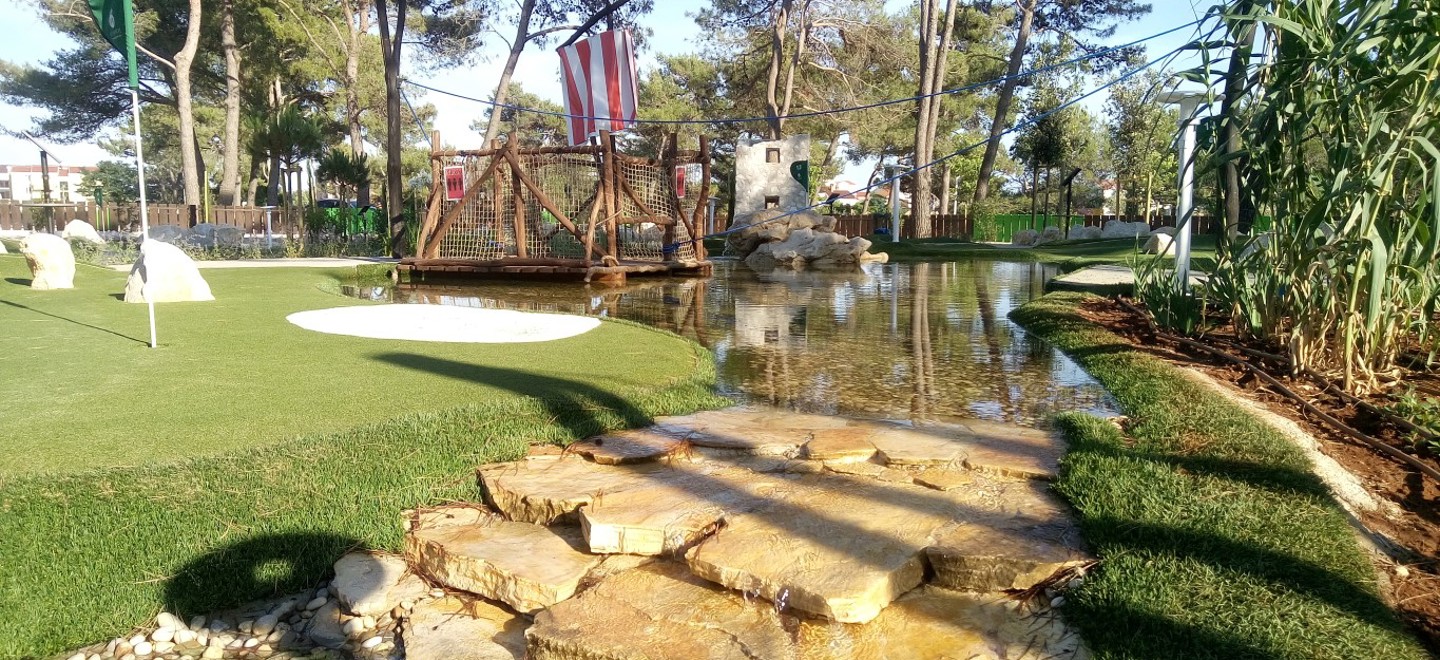 Besides providing great recreational fun for all age groups and families, the 18-hole course is themed on the cultural heritage of Zaton and Nin. Many of the holes include scaled down replicas of historical buildings and monuments, like the ancient church of St. Nicholas, the Tower Kaštelina, and the remains of Nin’s Roman temple and the Nin lagoon. Decorations comprise, amongst other things, a Croatian boat, a water-driven wooden crane, Roman amphorae, a mill stone, a treasure chest as well as numerous water features complete with stone bridges and a raft. Click here to see a video of the course.