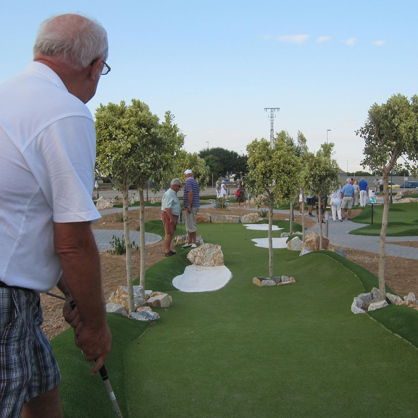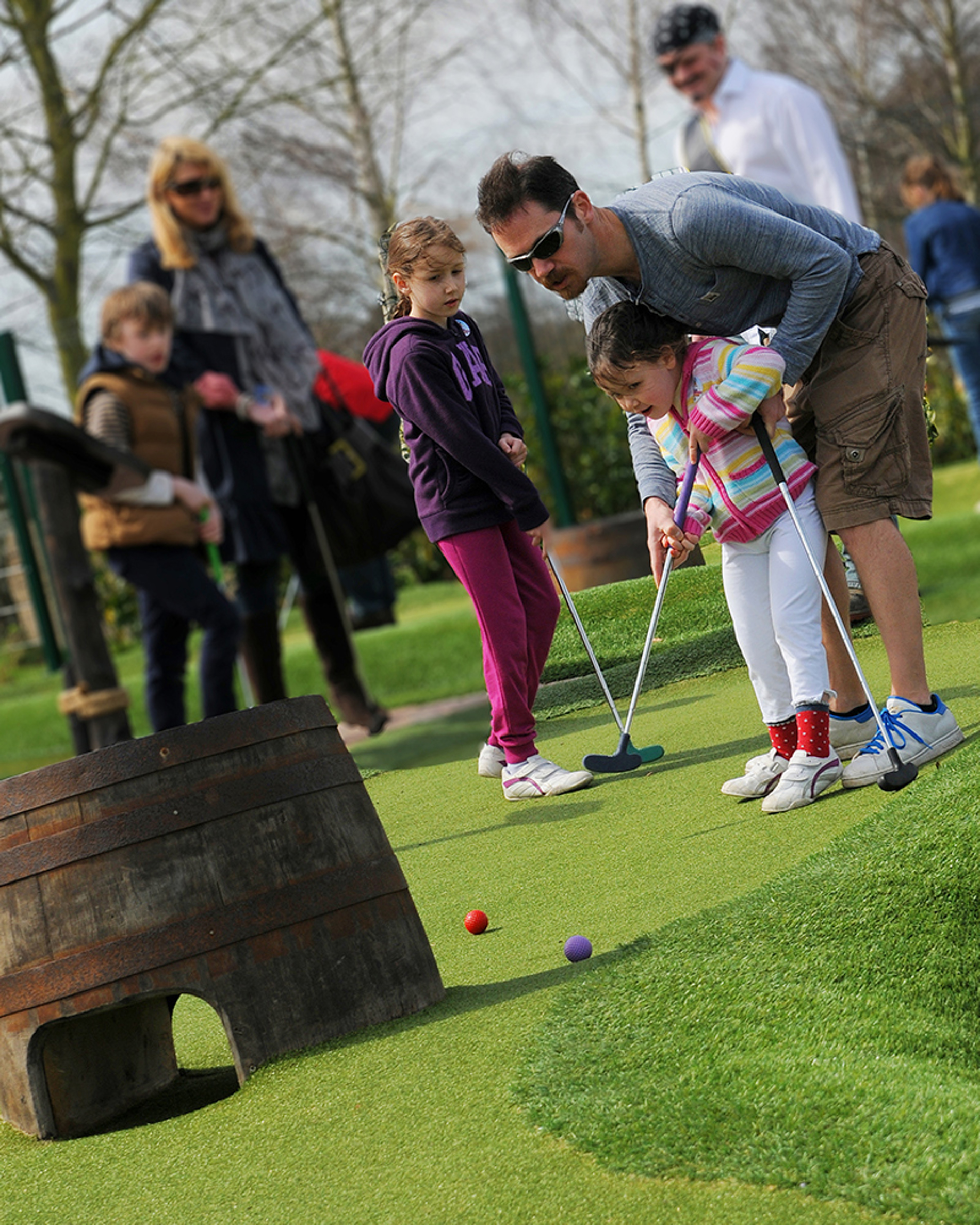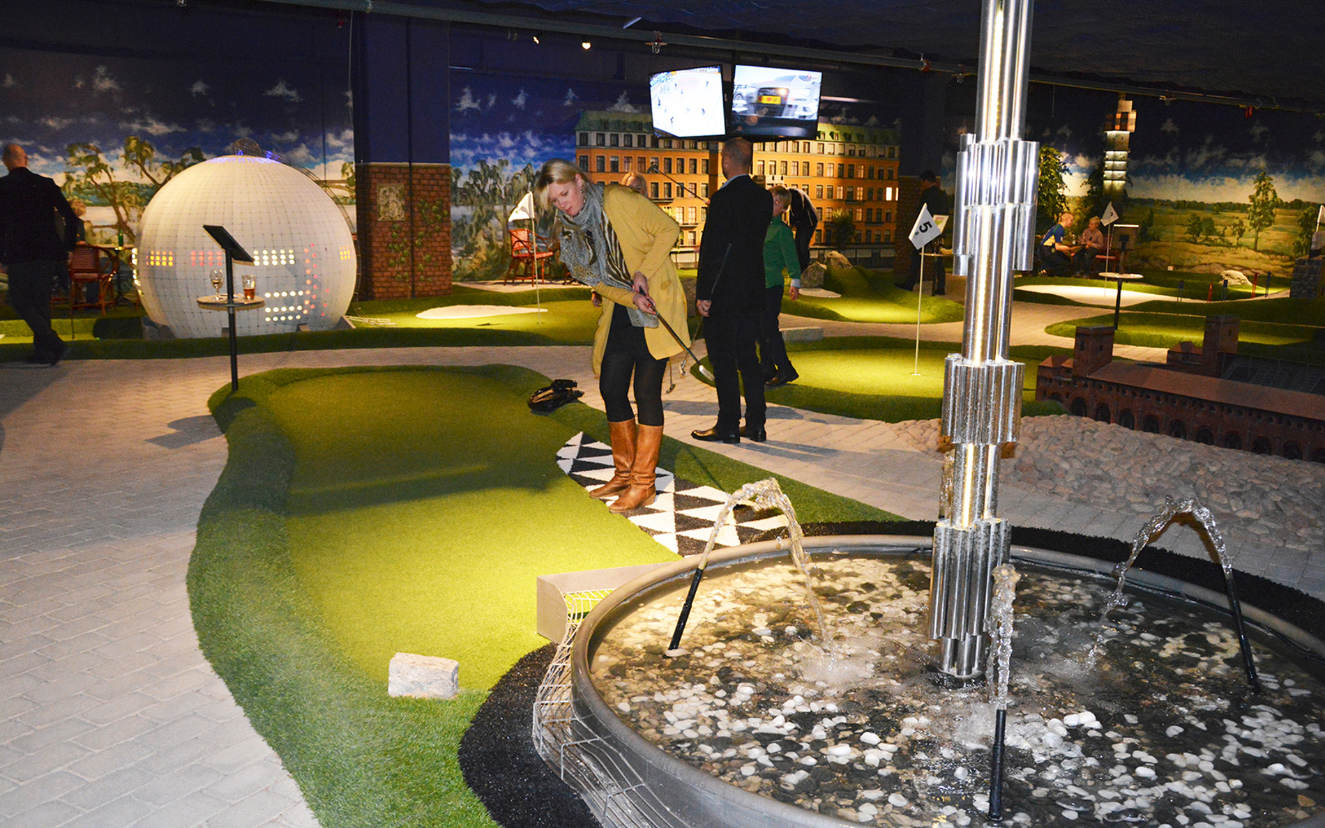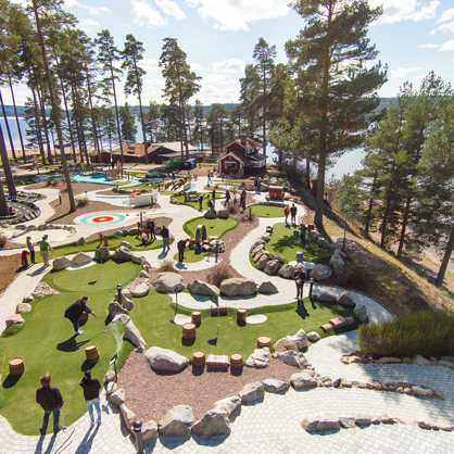 Adventure Golf is played on indoor or outdoor golf courses with a wide variety of themes. The courses may include buildings, water systems, bunkers, obstacles and ornamental elements.